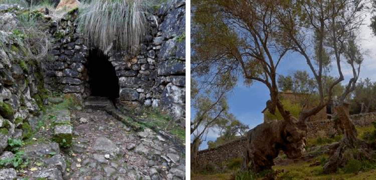 Justo antes de llegar a la Font De Bàlitx (mina de agua muy común en toda la sierra) nuestro camino gira bruscamente a la izquierda, desciende por el irregular y resbaladizo empedrado y vuelve a desviarse súbitamente hacia la derecha. Llegamos a las casas de Bàlitx d’en Mig. Aquí podemos admirar dos interesantes olivos: uno está frente a la entrada de la casa y el otro a la derecha del camino (es Bou de Bàlitx). Seguimos hasta llegar a un cruce de pistas. Tomamos la de la izquierda, para desviarnos, a pocos metros, por el sendero empedrado de la derecha (señalizado).